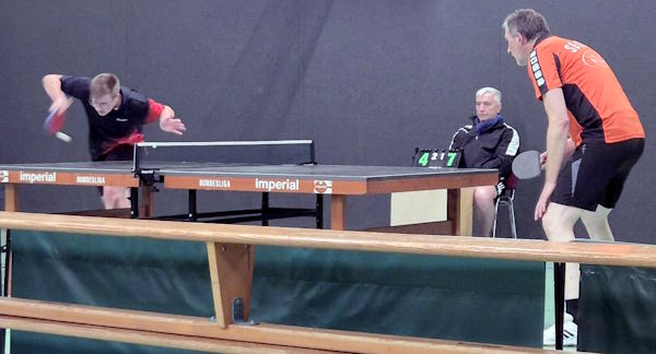 In der Zweiten Einzelrunde konnten das obere Paarkreuz um Stefan und Simon dann relativ schnell mit ungefährdeten Siegen auf 5:3 stellen, ein Hauch von Gesamtsieg lag in der Luft. Leider fand dann Niklas nicht zu seinem Spiel gegen das Abwehrspiel seines Gegners Cordes. |