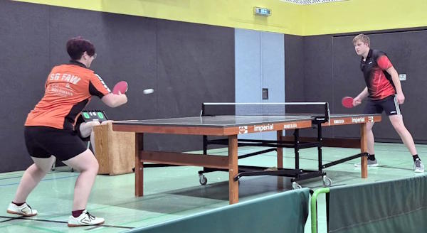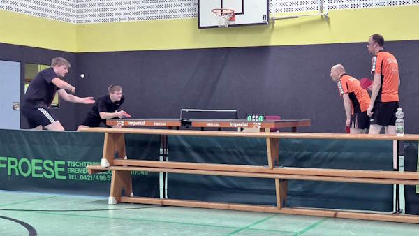 Niklas Grube und Ersatzspieler Ben Schlickowey (Vierte Erwachsene) fanden zunächst gut hinein, mussten sich aber nach vier umkämpften Sätzen dem bisher ungeschlagenen Spitzendoppel der Heimmannschaft geschlagen geben. Damit hieß es 1:1. |