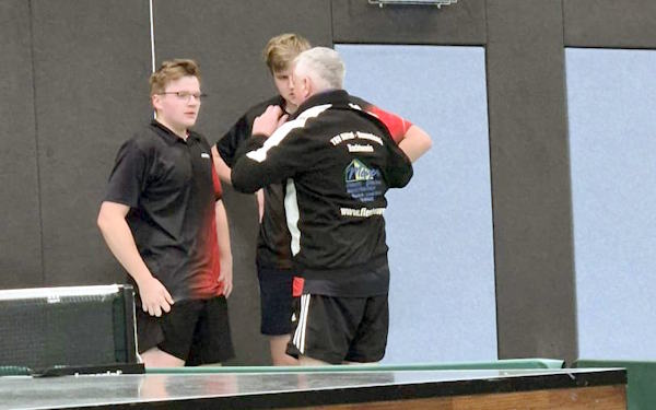 Stefan Jacob (von rechts) versucht, Ben Schlickowey und Niklas Grube gute Tipps fürs Doppel zu geben. |
