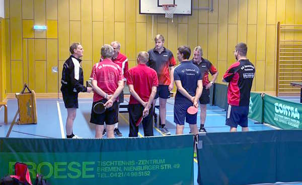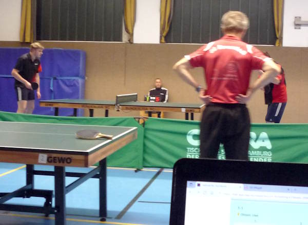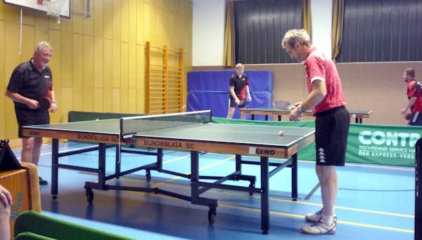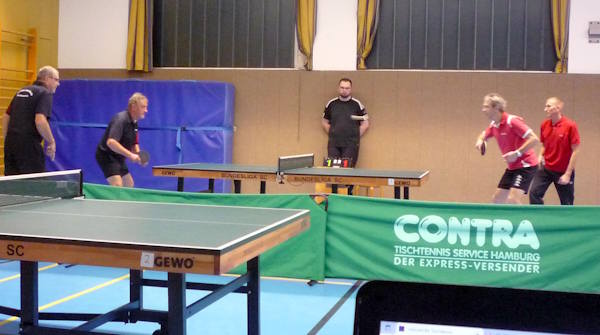 Schon der Start in den Doppeln zeigte deutlich: Hier treffen sich zwei Teams auf Augenhöhe. Uwe Ohlsen/ Uwe von Oesen konnten gegen Heins/ Lilge einen 3:2-Sieg verbuchen, Ben Schlickowey/ Christoph scheiterten 1:3 an Addix/ Roskamp. |