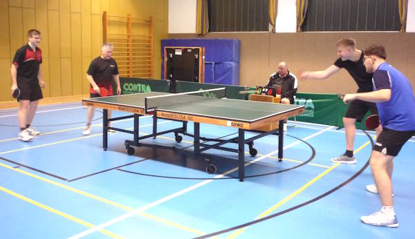 Das Finale im Doppel entscheiden (von links) Niklas Grube und Michael Peters gegen (von rechts) Enrico Linnemann (als Ersatz für Stefan Jacob) und Ben Schlickowey. |