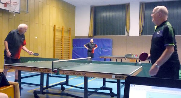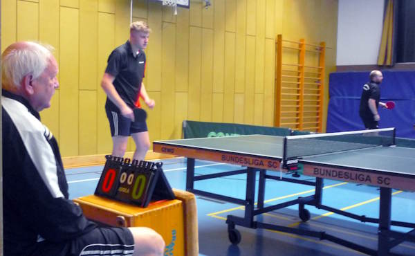 Bernd Matuttis (links) beobachtet fasziniert wie Ben Schlickowey (Mitte) und Bjarne Lünschen im oberen Paarkreuz alles gewinnen. |